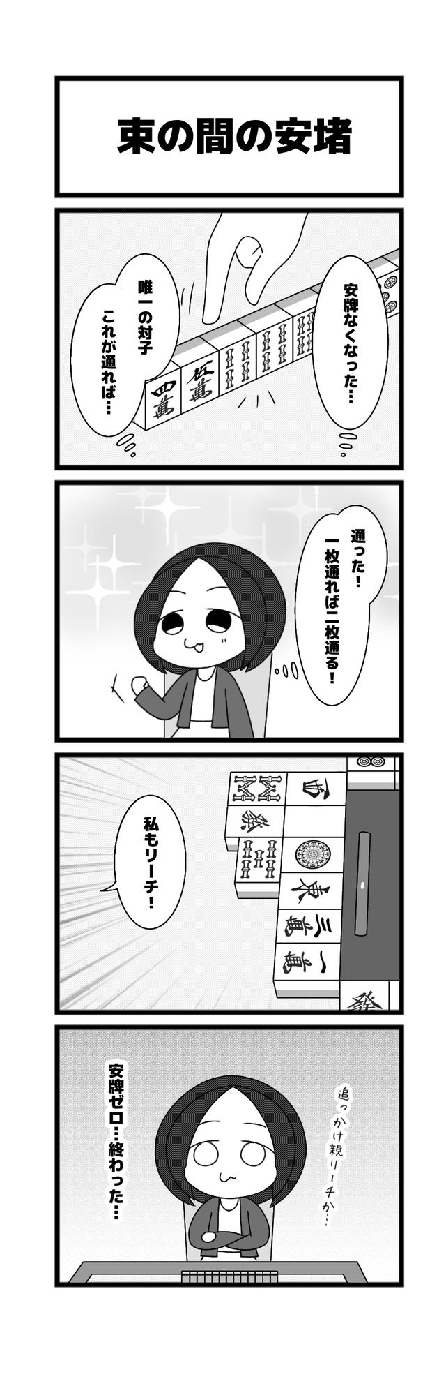 606本場「束の間の安堵」高橋 侑希2025年12月11日たかはしさんの『りーち、ですっ♪』~漫画版~ たかはしさんの『りーち、ですっ♪』~漫画版~とは 「たかはしさんの『りーち、ですっ♪』~漫画版~」は、高橋侑希プロ(@04Yvk1)による4コマ漫画です! 現役プロによる麻雀あるあるなどを漫画でおとどけします! ご意見・ご感想とネタがありましたら、お問い合わせフォームからどうぞ!! 二人リーチになっちゃったらもうお祈り!(まろちょふ) 他の漫画も読む! 2025年12月9日605本場「記念写真」2025年12月16日607本場「九種九牌」この記事のライター高橋 侑希日本プロ麻雀連盟中部本部29期生 中部プロリーグ Bリーグ所属 段位は二段岐阜県出身で現在は大阪在住麻雀ブル梅田店常勤「秋雨」という名前のうさぎを飼っている高橋侑希『りーち、ですっ♪』ライターの最新投稿2026年1月8日たかはしさんの『りーち、ですっ♪』~漫画版~614本場「麻雀も防寒」2026年1月6日たかはしさんの『りーち、ですっ♪』~漫画版~613本場「お腹いっぱい」2026年1月1日たかはしさんの『りーち、ですっ♪』~漫画版~612本場「今年はウマ年」高橋 侑希の記事一覧