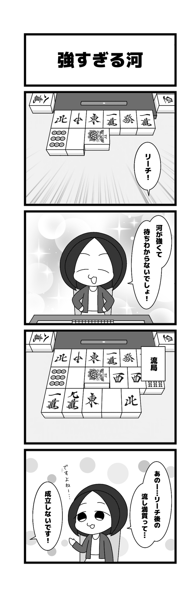 608本場「強すぎる河」高橋 侑希2025年12月18日たかはしさんの『りーち、ですっ♪』~漫画版~ たかはしさんの『りーち、ですっ♪』~漫画版~とは 「たかはしさんの『りーち、ですっ♪』~漫画版~」は、高橋侑希プロ(@04Yvk1)による4コマ漫画です! 現役プロによる麻雀あるあるなどを漫画でおとどけします! ご意見・ご感想とネタがありましたら、お問い合わせフォームからどうぞ!! 河が強すぎた結果・・・でもだいたいのネット麻雀ではリーチ後でも成立します!(まろちょふ) 他の漫画も読む! 2025年12月16日607本場「九種九牌」この記事のライター高橋 侑希日本プロ麻雀連盟中部本部29期生 中部プロリーグ Bリーグ所属 段位は二段岐阜県出身で現在は大阪在住麻雀ブル梅田店常勤「秋雨」という名前のうさぎを飼っている高橋侑希『りーち、ですっ♪』ライターの最新投稿2025年12月16日たかはしさんの『りーち、ですっ♪』~漫画版~607本場「九種九牌」2025年12月11日たかはしさんの『りーち、ですっ♪』~漫画版~606本場「束の間の安堵」2025年12月9日たかはしさんの『りーち、ですっ♪』~漫画版~605本場「記念写真」高橋 侑希の記事一覧