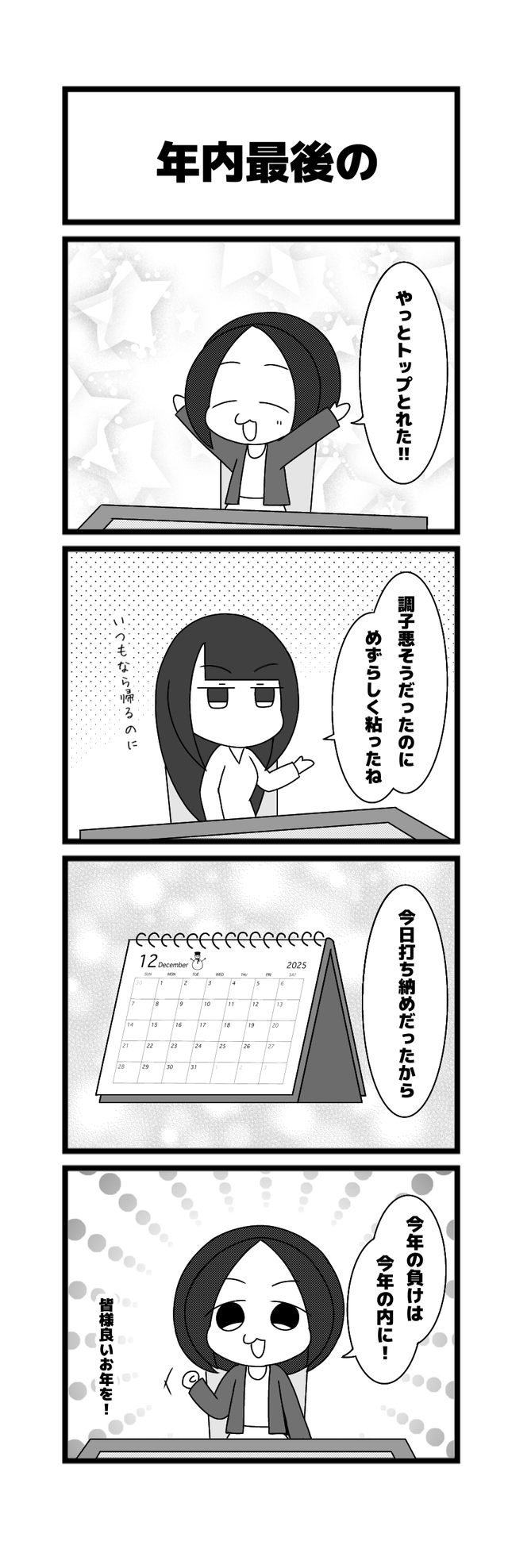 611本場「年内最後の」高橋 侑希2025年12月31日たかはしさんの『りーち、ですっ♪』~漫画版~ たかはしさんの『りーち、ですっ♪』~漫画版~とは 「たかはしさんの『りーち、ですっ♪』~漫画版~」は、高橋侑希プロ(@04Yvk1)による4コマ漫画です! 現役プロによる麻雀あるあるなどを漫画でおとどけします! ご意見・ご感想とネタがありましたら、お問い合わせフォームからどうぞ!! 年内最終戦はいい気分で終えたいものです、皆様良いお年を!(まろちょふ) 他の漫画も読む! 2025年12月25日610本場「何の時間?」この記事のライター高橋 侑希日本プロ麻雀連盟中部本部29期生 中部プロリーグ Bリーグ所属 段位は二段岐阜県出身で現在は大阪在住麻雀ブル梅田店常勤「秋雨」という名前のうさぎを飼っている高橋侑希『りーち、ですっ♪』ライターの最新投稿2025年12月25日たかはしさんの『りーち、ですっ♪』~漫画版~610本場「何の時間?」2025年12月23日たかはしさんの『りーち、ですっ♪』~漫画版~609本場「丸が2つ」2025年12月18日たかはしさんの『りーち、ですっ♪』~漫画版~608本場「強すぎる河」高橋 侑希の記事一覧