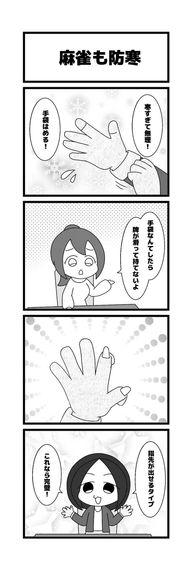 614本場「麻雀も防寒」高橋 侑希2026年1月8日たかはしさんの『りーち、ですっ♪』~漫画版~ たかはしさんの『りーち、ですっ♪』~漫画版~とは 「たかはしさんの『りーち、ですっ♪』~漫画版~」は、高橋侑希プロ(@04Yvk1)による4コマ漫画です! 現役プロによる麻雀あるあるなどを漫画でおとどけします! ご意見・ご感想とネタがありましたら、お問い合わせフォームからどうぞ!! やってみようと思ったことはありましたがどうしても理牌がスムーズにできずに無理でした(まろちょふ) 他の漫画も読む! 2026年1月6日613本場「お腹いっぱい」この記事のライター高橋 侑希日本プロ麻雀連盟中部本部29期生 中部プロリーグ Bリーグ所属 段位は二段岐阜県出身で現在は大阪在住麻雀ブル梅田店常勤「秋雨」という名前のうさぎを飼っている高橋侑希『りーち、ですっ♪』ライターの最新投稿2026年1月6日たかはしさんの『りーち、ですっ♪』~漫画版~613本場「お腹いっぱい」2026年1月1日たかはしさんの『りーち、ですっ♪』~漫画版~612本場「今年はウマ年」2025年12月31日たかはしさんの『りーち、ですっ♪』~漫画版~611本場「年内最後の」高橋 侑希の記事一覧