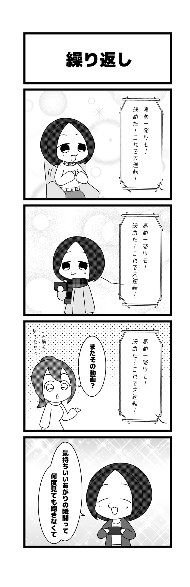 625本場「繰り返し」高橋 侑希2026年2月17日たかはしさんの『りーち、ですっ♪』~漫画版~ たかはしさんの『りーち、ですっ♪』~漫画版~とは 「たかはしさんの『りーち、ですっ♪』~漫画版~」は、高橋侑希プロ(@04Yvk1)による4コマ漫画です! 現役プロによる麻雀あるあるなどを漫画でおとどけします! ご意見・ご感想とネタがありましたら、お問い合わせフォームからどうぞ!! タイトル戴冠した高橋さんの新たなルーティンが産まれてしまったのかもしれない!皆さんも、何度見ても嬉しくなる劇的なアガリのシーンがあるはず!(まろちょふ) 他の漫画も読む! 2026年2月12日624本場「運だけ」この記事のライター高橋 侑希日本プロ麻雀連盟中部本部29期生 中部プロリーグ Bリーグ所属 段位は二段岐阜県出身で現在は大阪在住麻雀ブル梅田店常勤「秋雨」という名前のうさぎを飼っている高橋侑希『りーち、ですっ♪』ライターの最新投稿2026年2月12日たかはしさんの『りーち、ですっ♪』~漫画版~624本場「運だけ」2026年2月10日たかはしさんの『りーち、ですっ♪』~漫画版~623本場「反省会」2026年2月5日たかはしさんの『りーち、ですっ♪』~漫画版~622本場「疲労の理由」高橋 侑希の記事一覧