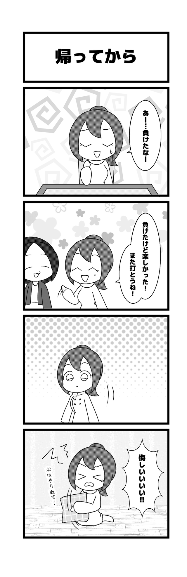 627本場「帰ってから」高橋 侑希2026年2月24日たかはしさんの『りーち、ですっ♪』~漫画版~ たかはしさんの『りーち、ですっ♪』~漫画版~とは 「たかはしさんの『りーち、ですっ♪』~漫画版~」は、高橋侑希プロ(@04Yvk1)による4コマ漫画です! 現役プロによる麻雀あるあるなどを漫画でおとどけします! ご意見・ご感想とネタがありましたら、お問い合わせフォームからどうぞ!! 悔しさも持ちつつ次打つ時はしっかり気持ちをリセットして臨みましょう!(まろちょふ) 他の漫画も読む! 2026年2月19日626本場「親との戦い」2026年2月26日628本場「ドヤ顔から」この記事のライター高橋 侑希日本プロ麻雀連盟中部本部29期生 中部プロリーグ Bリーグ所属 段位は二段岐阜県出身で現在は大阪在住麻雀ブル梅田店常勤「秋雨」という名前のうさぎを飼っている高橋侑希『りーち、ですっ♪』ライターの最新投稿2026年3月12日たかはしさんの『りーち、ですっ♪』~漫画版~632本場「春の訪れ」2026年3月10日たかはしさんの『りーち、ですっ♪』~漫画版~631本場「足して足して」2026年3月5日たかはしさんの『りーち、ですっ♪』~漫画版~630本場「解ける」高橋 侑希の記事一覧