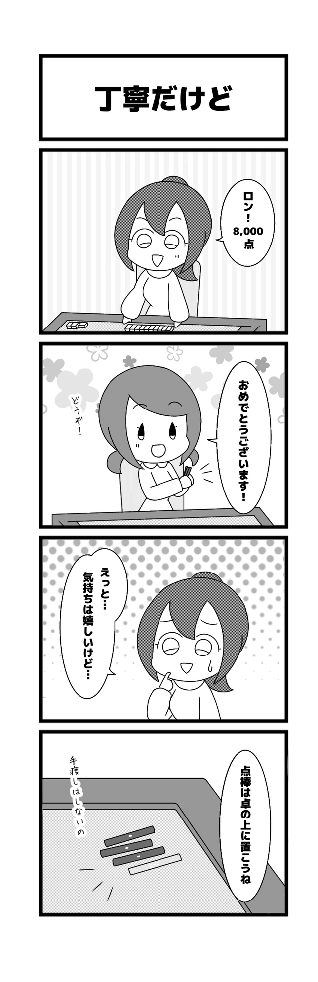629本場「丁寧だけど」高橋 侑希2026年3月3日たかはしさんの『りーち、ですっ♪』~漫画版~ たかはしさんの『りーち、ですっ♪』~漫画版~とは 「たかはしさんの『りーち、ですっ♪』~漫画版~」は、高橋侑希プロ(@04Yvk1)による4コマ漫画です! 現役プロによる麻雀あるあるなどを漫画でおとどけします! ご意見・ご感想とネタがありましたら、お問い合わせフォームからどうぞ!! 手を伸ばして相手の手元に置くのがコツです!(まろちょふ) 他の漫画も読む! 2026年2月26日628本場「ドヤ顔から」この記事のライター高橋 侑希日本プロ麻雀連盟中部本部29期生 中部プロリーグ Bリーグ所属 段位は二段岐阜県出身で現在は大阪在住麻雀ブル梅田店常勤「秋雨」という名前のうさぎを飼っている高橋侑希『りーち、ですっ♪』ライターの最新投稿2026年2月26日たかはしさんの『りーち、ですっ♪』~漫画版~628本場「ドヤ顔から」2026年2月24日たかはしさんの『りーち、ですっ♪』~漫画版~627本場「帰ってから」2026年2月19日たかはしさんの『りーち、ですっ♪』~漫画版~626本場「親との戦い」高橋 侑希の記事一覧