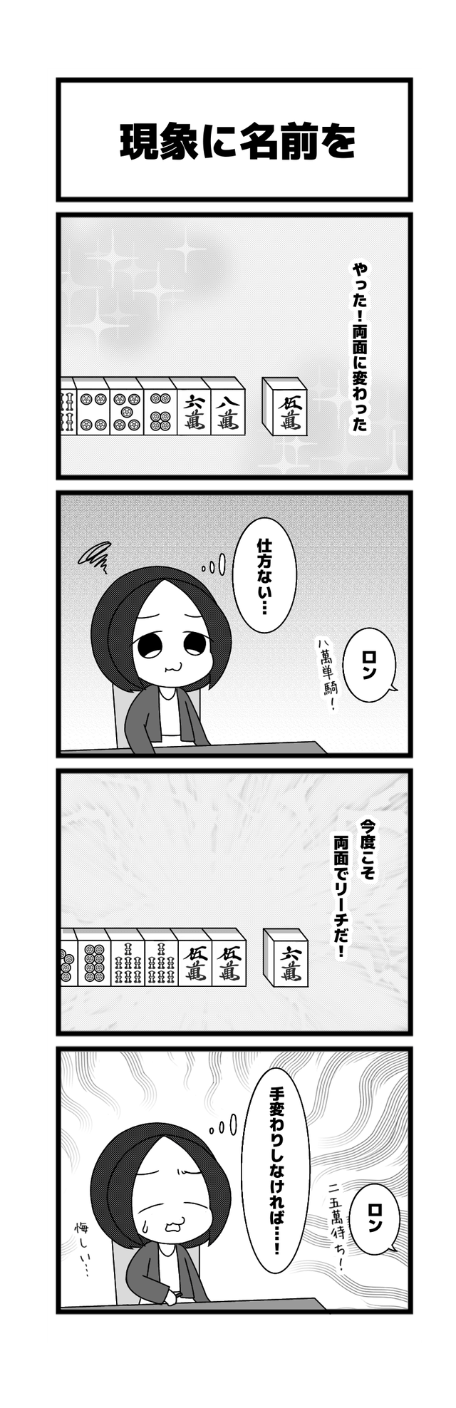 637本場「現象に名前を」高橋 侑希2026年3月31日たかはしさんの『りーち、ですっ♪』~漫画版~ たかはしさんの『りーち、ですっ♪』~漫画版~とは 「たかはしさんの『りーち、ですっ♪』~漫画版~」は、高橋侑希プロ(@04Yvk1)による4コマ漫画です! 現役プロによる麻雀あるあるなどを漫画でおとどけします! ご意見・ご感想とネタがありましたら、お問い合わせフォームからどうぞ!! いい手替わりした結果放銃になってしまう苦しいあるある・・・だけど名前は思いつかない・・・(まろちょふ) 他の漫画も読む! 2026年3月26日636本場「縦?横?」この記事のライター高橋 侑希日本プロ麻雀連盟中部本部29期生 中部プロリーグ Bリーグ所属 段位は二段岐阜県出身で現在は大阪在住麻雀ブル梅田店常勤「秋雨」という名前のうさぎを飼っている高橋侑希『りーち、ですっ♪』ライターの最新投稿2026年3月26日たかはしさんの『りーち、ですっ♪』~漫画版~636本場「縦?横?」2026年3月24日たかはしさんの『りーち、ですっ♪』~漫画版~635本場「シャンポン?」2026年3月19日たかはしさんの『りーち、ですっ♪』~漫画版~634本場「ボリューム」高橋 侑希の記事一覧
