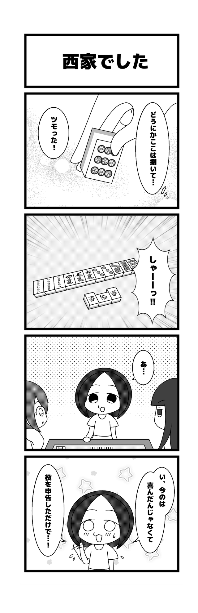 643本場「西家でした」高橋 侑希2026年4月21日たかはしさんの『りーち、ですっ♪』~漫画版~ たかはしさんの『りーち、ですっ♪』~漫画版~とは 「たかはしさんの『りーち、ですっ♪』~漫画版~」は、高橋侑希プロ(@04Yvk1)による4コマ漫画です! 現役プロによる麻雀あるあるなどを漫画でおとどけします! ご意見・ご感想とネタがありましたら、お問い合わせフォームからどうぞ!! 普段役を申告していないのに?妙だな・・・・?(まろちょふ) 他の漫画も読む! 2026年4月16日642本場「どんな香り?」この記事のライター高橋 侑希日本プロ麻雀連盟中部本部29期生 中部プロリーグ Bリーグ所属 段位は二段岐阜県出身で現在は大阪在住麻雀ブル梅田店常勤「秋雨」という名前のうさぎを飼っている高橋侑希『りーち、ですっ♪』ライターの最新投稿2026年4月16日たかはしさんの『りーち、ですっ♪』~漫画版~642本場「どんな香り?」2026年4月14日たかはしさんの『りーち、ですっ♪』~漫画版~641本場「たこ焼きって」2026年4月9日たかはしさんの『りーち、ですっ♪』~漫画版~640本場「テンパネ」高橋 侑希の記事一覧