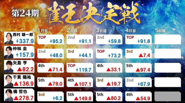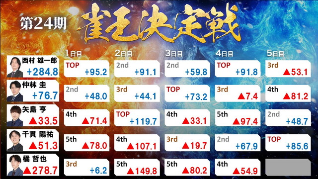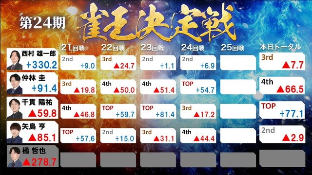 最終日、西村は2,3,2,2と安定した立ち回りを重ね失点を防いでいく。一方仲林は苦戦。23回戦終了時点で大きく点差が開き、西村の優勝が濃厚な状況で最終戦を迎えた。