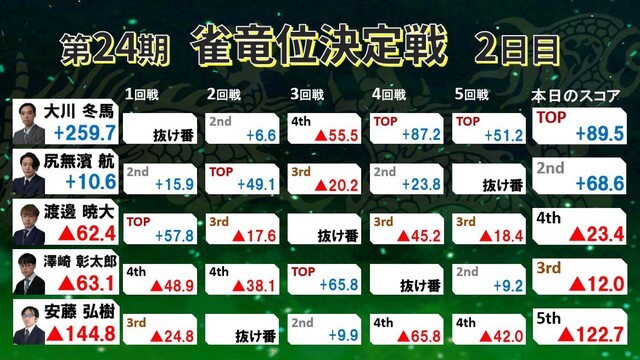 初日、二日目を終え、大川が2位の尻無濱と249.1ポイント差をつける独走状態。2度の大三元を決めるなど場を制圧し完勝ムードで最終日へ。前雀竜位の安藤弘樹は2日終了時点で敗退となった。