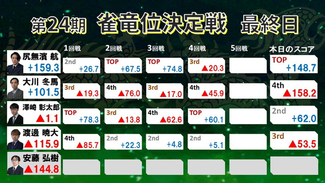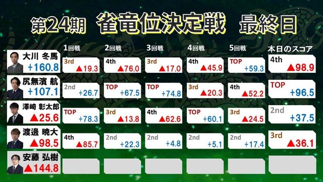 まさかの展開となった中、大川は動じず最終戦に臨みトップを取り切った。ライバルの尻無濱を4着とし、トップラスを決めて再逆転での雀竜位初戴冠となった。