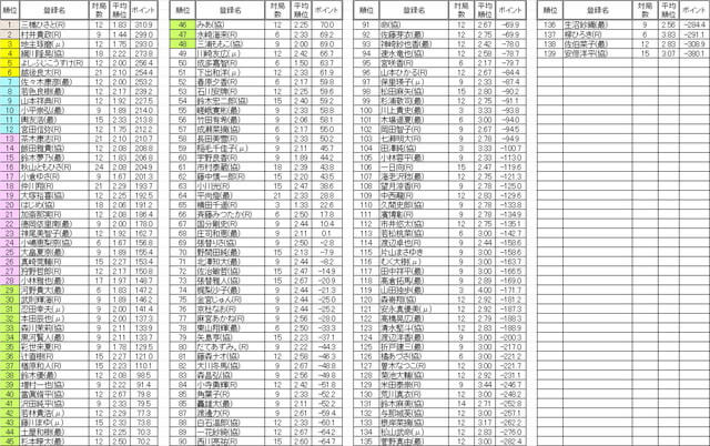 出場選手も増えてきており、規定の12試合を消化する選手も増えてきた、プレーオフボーダーのスコアも徐々に上昇している。