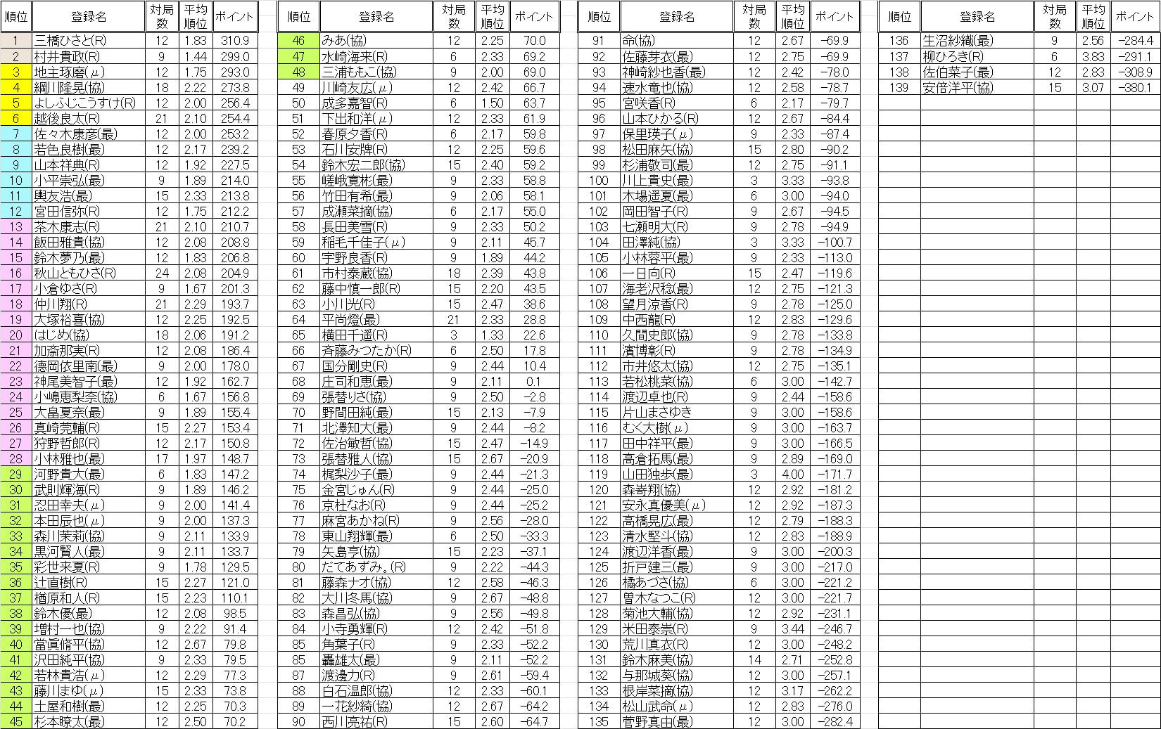 先日の朱雀リーグ第9節は春日にてトップ2着トップで142ポイント勝ちました。