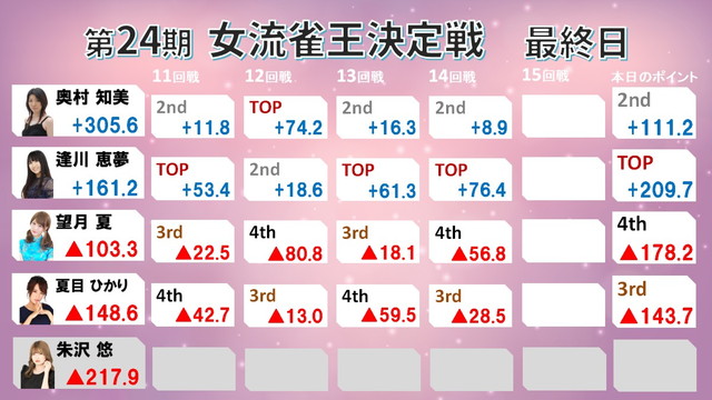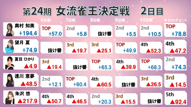 逢川が4戦3トップで追い上げるも、奥村も連対を外さずリードをゆるぎないものとなった。
