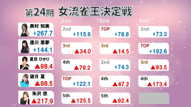 3日間、計15戦を戦い女流雀王を決する。