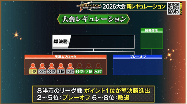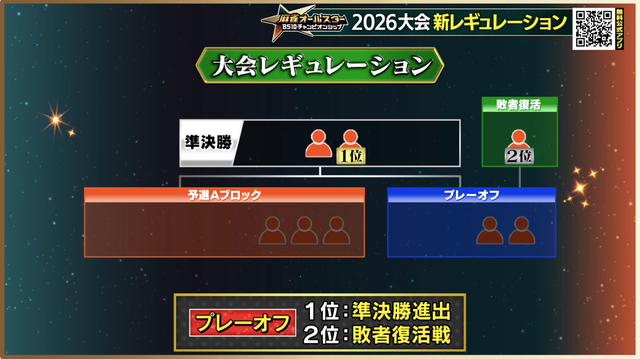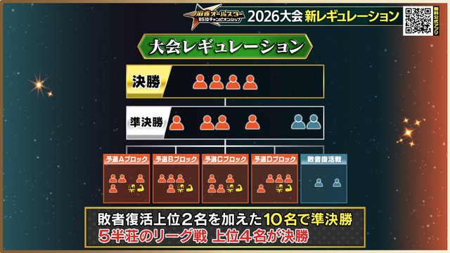 32名の選手をそれぞれ8名ずつの4ブロックに振り分け、各ブロックで予選が行われる。1人8半荘を戦い、トータルポイントの上位2名が準決勝へ、3位の選手が敗者復活戦を戦う。敗者復活戦の勝者1名を加えた9名で準決勝を戦い、その上位4名が決勝に駒を進める。