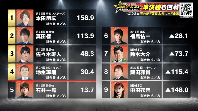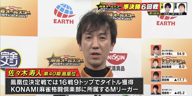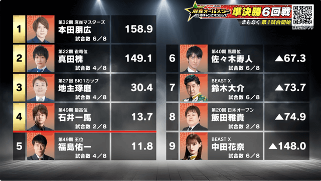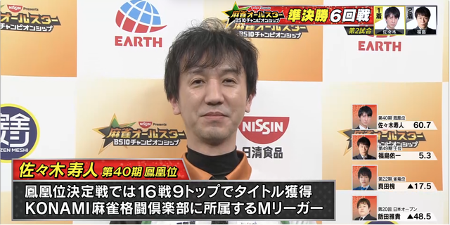 11月5日に「日清食品 Presents 麻雀オールスター BS10チャンピオンシップ」の準決勝6回戦の模様が放送された。