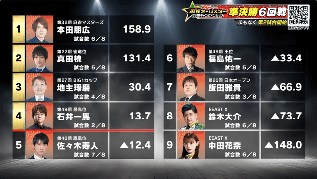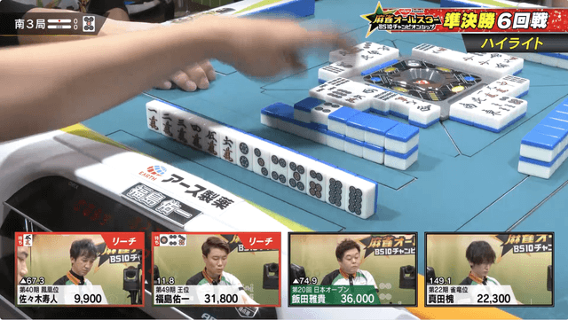 オーラスは寿人と飯田が9100点差。満貫ツモか5200以上の直撃条件だったが、寿人がドラポンの仕掛けで飯田から直撃をもぎ取り鮮やかな逆転勝利となった。