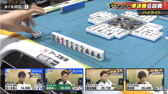 南2局には福島がトップ目から2000オールを決めて一歩リードとなった。