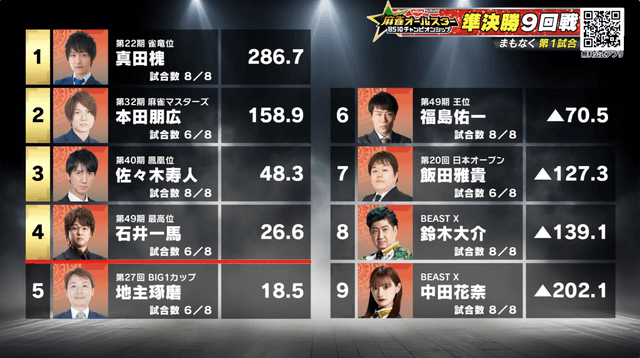 本田は決勝戦当確、決勝戦に持ち越すポイントを増やすための戦いに。地主と一馬はトップを取れれば決勝確定。トップが取れない場合はお互いとの着順争いが焦点となる。飯田は特大トップが必要な最終戦となった。
