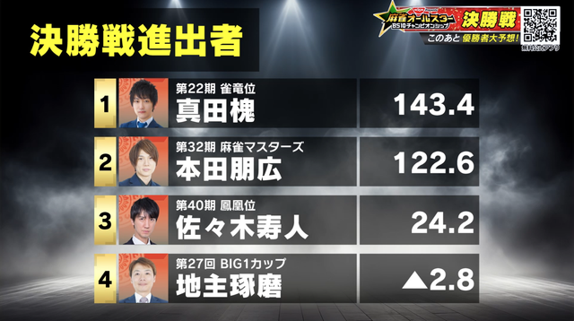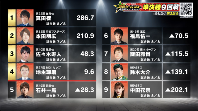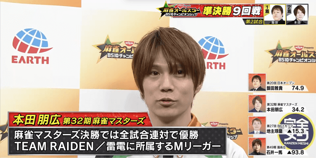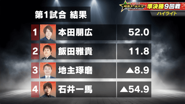 最終的には地主が3着を確定するアガリで決着。飯田がトップを獲得したものの決勝圏内までは進めず、2着の本田と3着の地主が決勝進出を決めた。