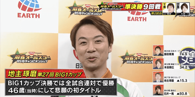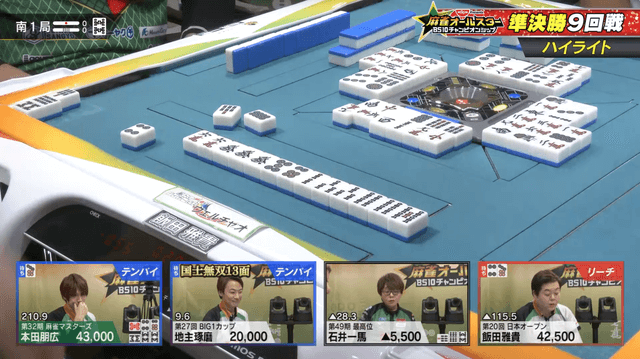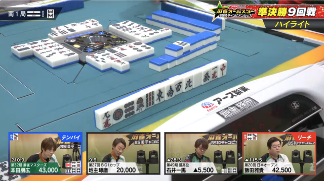 南1局は本田の仕掛けと飯田のリーチが入る中、それに受けながら進行していた地主にまさかの国士無双十三面待ちのフリテン聴牌が入る。