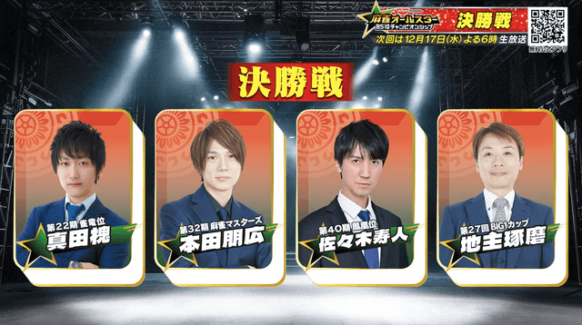 11月23日に「日清食品 Presents 麻雀オールスター BS10チャンピオンシップ」の準決勝最終戦となる9回戦の模様が放送された。