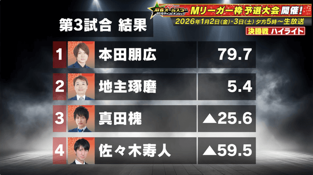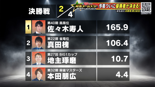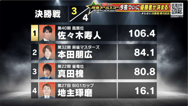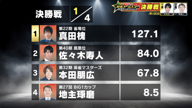 決勝戦には準決勝で首位から4位となった真田槐、本田朋広、佐々木寿人、地主琢磨が進出。