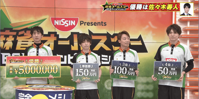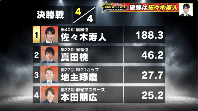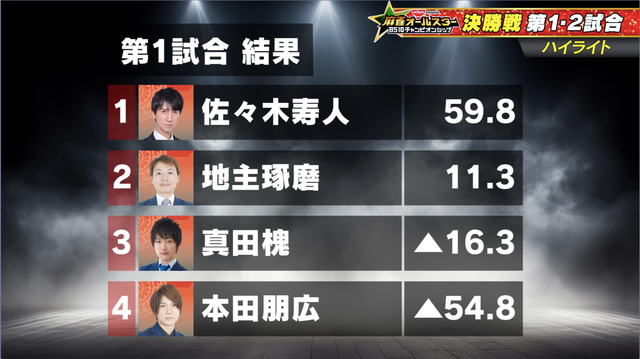 寿人が優位な立場のまま迎えた南4局、地主がトータル3位に浮上する12000のアガリで決着。佐々木寿人が決勝4戦中3勝。圧巻の立ち回りで優勝を勝ち取った。