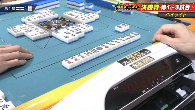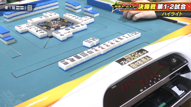 東1局、3人聴牌の競り合いを制したのは地主、寿人から8000のアガリを決める。