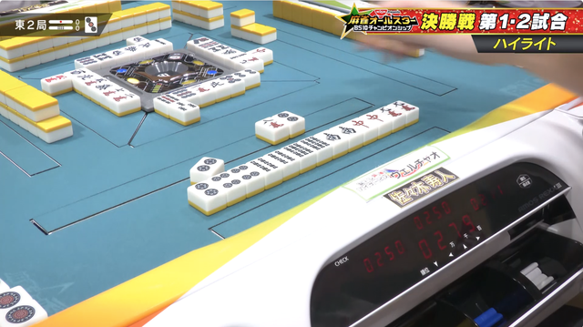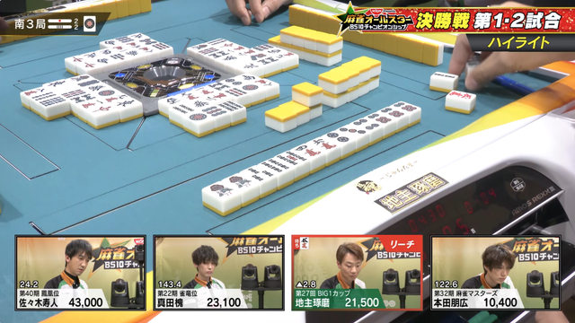 南3局2本場 親の地主が4000オールを決めて寿人に迫るも最後は寿人が逃げ切る形で決着。