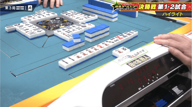 第1試合でトップを取った寿人が第2試合も快調な滑り出し、東2局にリーチ・七対子・裏2の8000を本田からアガってリードを得る。