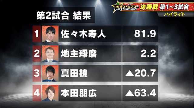 トータル3位の寿人がトップ、4位の地主が2着で全体のポイント差は大きく縮まった。