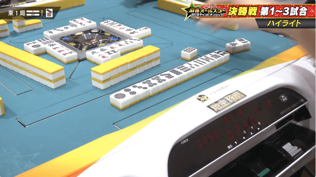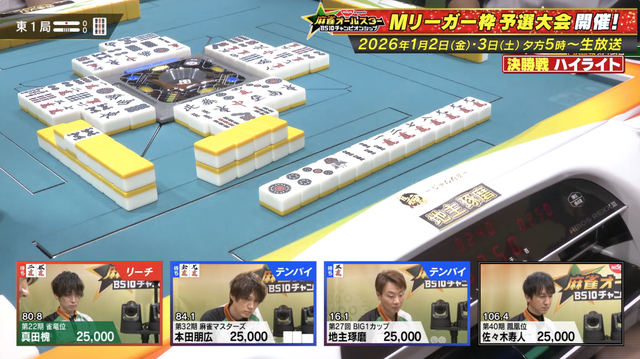 東1局、親番の本田が3人聴牌の競り合いを制して寿人から5800のアガリで一歩リード。