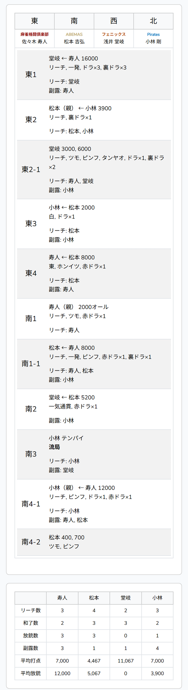 待ちをダマテンに構える。直後、寿人も三副露めを入れてテンパイ。さらに、堂岐が門前でテンパイを果たし、先制リーチ。寿人が一発でつかみ、堂岐が牌を倒すと、裏ドラが合計3枚乗って合計6枚に。16000点のアガリとなった。