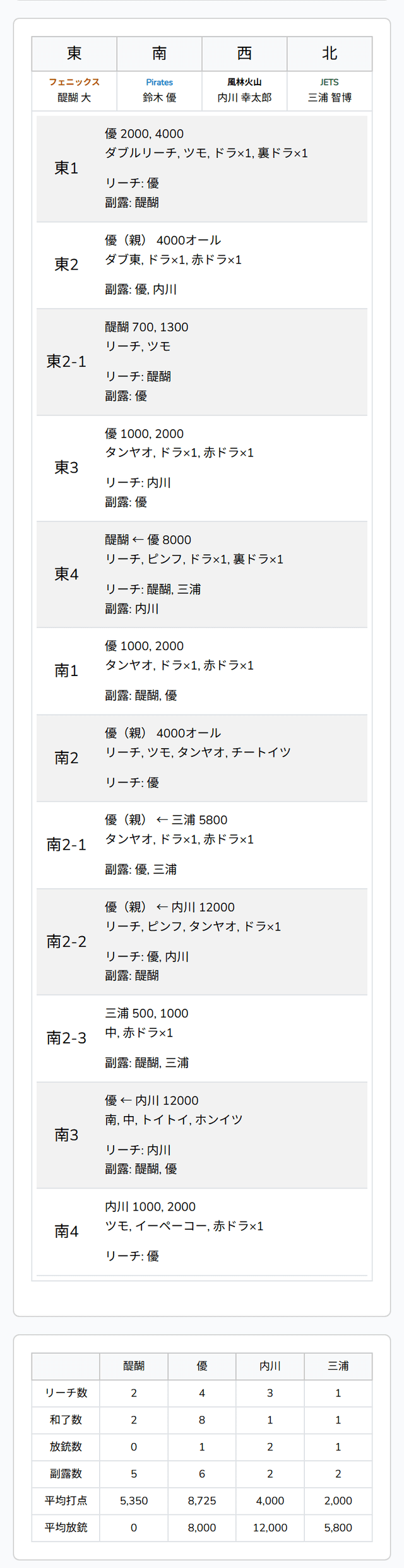 南3局、3巡目に親の内川が待ちで先制リーチ。そこに優がマンズのホンイツで仕掛けて