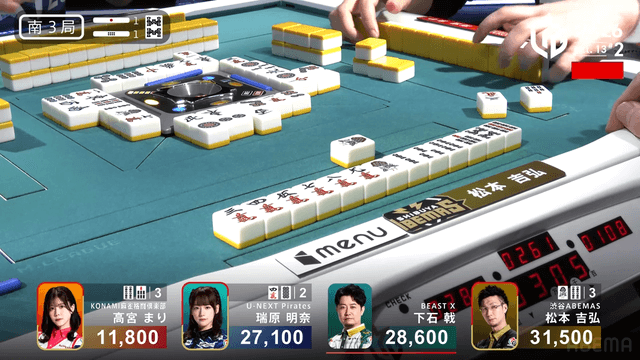 南3局1本場、高宮が待ちでリーチ。そこに瑞原が