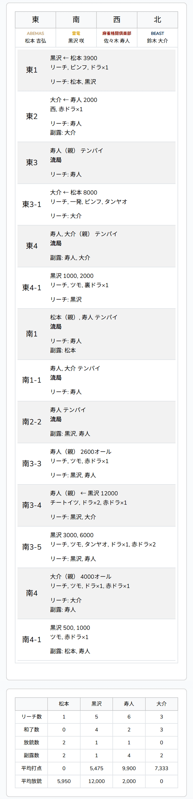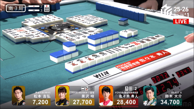 南3局3本場 黒沢が待ちで先制リーチをかけるが、親番寿人も追いつく。寿人は