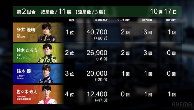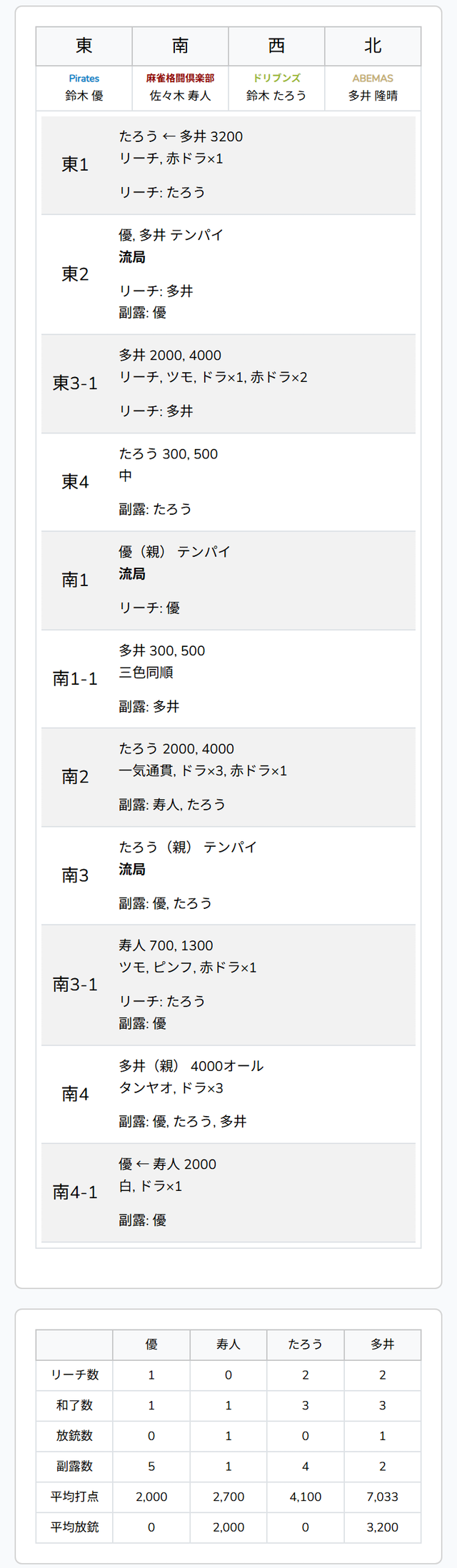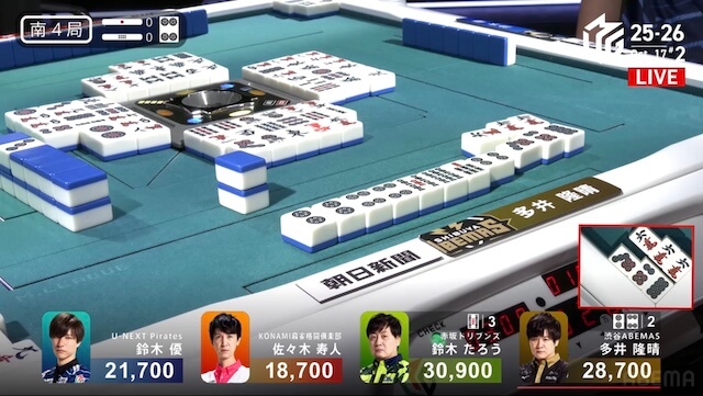 南4局、トップ目のたろうが二副露してファーストテンパイ。2着目で親の多井が追いつく。たろうは終盤、危険牌を引いて雀頭のトイツ落としで迂回し、再びテンパイを入れ直した。しかし最後は、多井が高めのドラをツモアガリ。大きなリードを築いた。