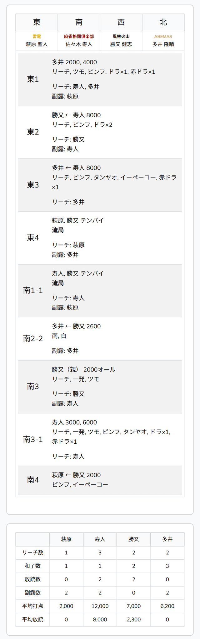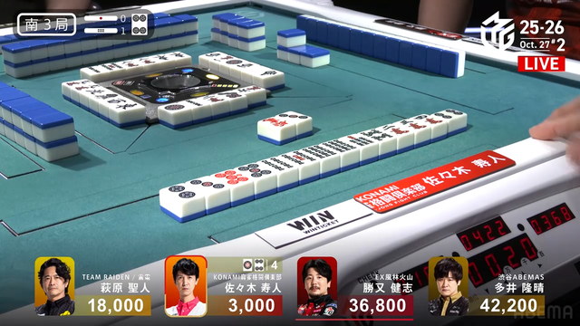 南3局1本場、佐々木寿人選手 の跳満ツモ!