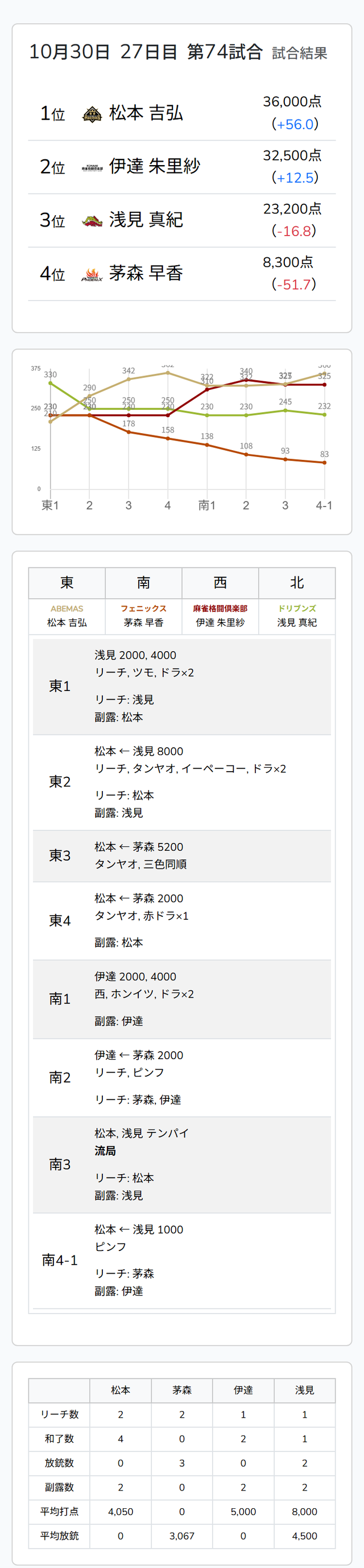 Mリーグ試合速報 10/30 LIVEch 第1試合【浅見・茅森・松本・伊達】麻雀ウォッチ編集部2025年10月30日Mリーグ速報 第1試合結果記事 【10/30 Mリーグ2025-26 第1試合結果】麻雀chは的確な攻守の選択を見せた下石戟がトップ獲得!LIVEchは東場のリードを守りきった松本吉弘が接戦を制してトップ奪取! 第2試合結果記事 【10/30 Mリーグ2025-26 第2試合結果】麻雀chは鮮やかな高打点で東城りおがトップ、チーム同日2連勝を飾る!LIVEchは高宮まりが豪快なアガリで快勝! ▼日程・結果 日程・結果【Mリーグ】-2025-26SEASON ▼選手・チーム成績スタッツ 成績・データ【Mリーグ 2025-26シーズン】 2025年10月30日Mリーグ試合速報 10/30 麻雀ch 第1試合【阿久津・下石・黒沢・永井】2025年10月30日Mリーグ試合速報 10/30 LIVEch 第2試合【醍醐・高宮・園田・多井】この記事のライター麻雀ウォッチ編集部麻雀界の最新ニュース、コラム、インタビュー、ランキング、スケジュールなど、麻雀に関するあらゆる情報を発信する日本最大級の麻雀ニュースサイトです。ライターの最新投稿2025年11月6日Mリーグ【11/6 Mリーグ2025-26 第2試合結果】麻雀chは石井一馬が終盤に巻き返して三つ巴のトップ争...2025年11月6日Mリーグ【11/6 Mリーグ2025-26 第1試合結果】麻雀chでは果敢に二軒リーチに斬りこんだ高宮まりがト...2025年11月6日Mリーグ速報Mリーグ試合速報 11/6 LIVEch 第2試合【本田・下石・白鳥・太】麻雀ウォッチ編集部の記事一覧