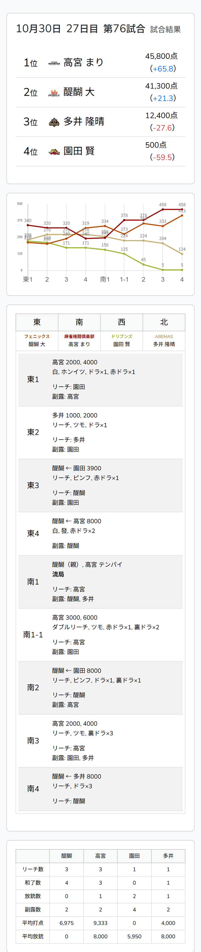 Mリーグ試合速報 10/30 LIVEch 第2試合【醍醐・高宮・園田・多井】麻雀ウォッチ編集部2025年10月30日Mリーグ速報 第1試合結果記事 【10/30 Mリーグ2025-26 第1試合結果】麻雀chは的確な攻守の選択を見せた下石戟がトップ獲得!LIVEchは東場のリードを守りきった松本吉弘が接戦を制してトップ奪取! 第2試合結果記事 【10/30 Mリーグ2025-26 第2試合結果】麻雀chは鮮やかな高打点で東城りおがトップ、チーム同日2連勝を飾る!LIVEchは高宮まりが豪快なアガリで快勝! ▼日程・結果 日程・結果【Mリーグ】-2025-26SEASON ▼選手・チーム成績スタッツ 成績・データ【Mリーグ 2025-26シーズン】 2025年10月30日Mリーグ試合速報 10/30 LIVEch 第1試合【浅見・茅森・松本・伊達】2025年10月30日Mリーグ試合速報 10/30 麻雀ch 第2試合【東城・渋川・内川・瀬戸熊】この記事のライター麻雀ウォッチ編集部麻雀界の最新ニュース、コラム、インタビュー、ランキング、スケジュールなど、麻雀に関するあらゆる情報を発信する日本最大級の麻雀ニュースサイトです。ライターの最新投稿2025年10月30日Mリーグ【10/30 Mリーグ2025-26 第2試合結果】麻雀chは鮮やかな高打点で東城りおがトップ、チーム...2025年10月30日Mリーグ【10/30 Mリーグ2025-26 第1試合結果】麻雀chは的確な攻守の選択を見せた下石戟がトップ獲...2025年10月30日Mリーグ速報Mリーグ試合速報 10/30 麻雀ch 第2試合【東城・渋川・内川・瀬戸熊】麻雀ウォッチ編集部の記事一覧