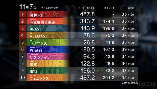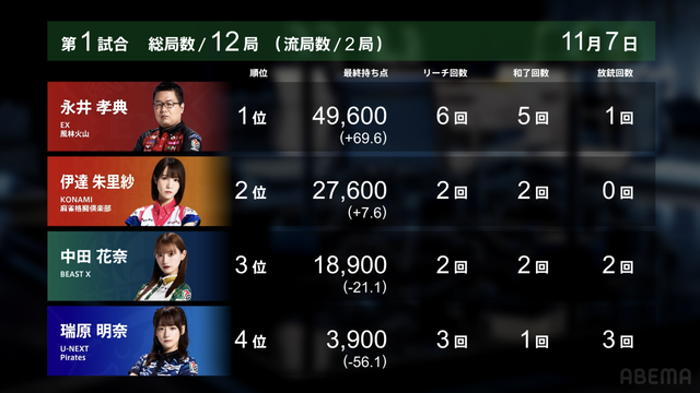 Mリーグ【11/6 Mリーグ2025-26 第1試合結果】麻雀chでは果敢に二軒リーチに斬りこんだ高宮まりがトップ獲得!LIVEchでは僅差の争いを制した東城りおがトップ!BEAST Xは3桁プラスへ!