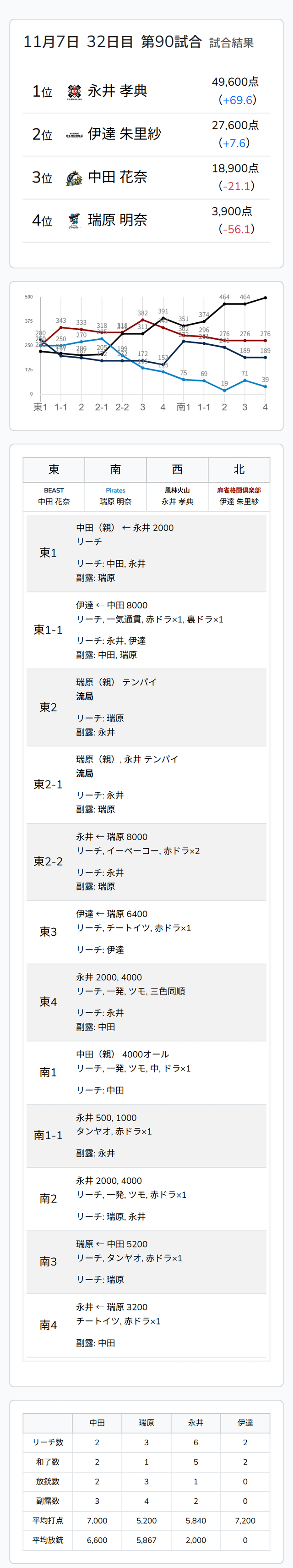 Mリーグ試合速報 11/7 LIVEch 第1試合【中田・瑞原・永井・伊達】麻雀ウォッチ編集部2025年11月7日Mリーグ速報 第1試合結果記事 【11/7 Mリーグ2025-26 第1試合結果】麻雀chは大混戦のオーラスを制した松本吉弘が逆転トップ、LIVEchは永井孝典が3連闘3連勝を達成! 第2試合結果記事 【11/7 Mリーグ2025-26 第2試合結果】麻雀chは熾烈なオーラスを制した渡辺太、LIVEchはオーラスに値千金の親満貫を決めた東城りおがトップ獲得!東城は個人3連勝達成! 第1試合詳細結果 ©ABEMA 第1試合終了時点のトータルランキング ©ABEMA ▼日程・結果 日程・結果【Mリーグ】-2025-26SEASON ▼選手・チーム成績スタッツ 成績・データ【Mリーグ 2025-26シーズン】 2025年11月7日Mリーグ試合速報 11/7 麻雀ch 第1試合【醍醐・逢川・松本・たろう】2025年11月7日Mリーグ試合速報 11/7 LIVEch 第2試合【永井・高宮・優・東城】この記事のライター麻雀ウォッチ編集部麻雀界の最新ニュース、コラム、インタビュー、ランキング、スケジュールなど、麻雀に関するあらゆる情報を発信する日本最大級の麻雀ニュースサイトです。ライターの最新投稿2025年11月7日Mリーグ【11/7 Mリーグ2025-26 第1試合結果】麻雀chは大混戦のオーラスを制した松本吉弘が逆転トッ...2025年11月7日Mリーグ速報Mリーグ試合速報 11/7 麻雀ch 第2試合【日向・太・柴田・堂岐】2025年11月7日Mリーグ速報Mリーグ試合速報 11/7 LIVEch 第2試合【永井・高宮・優・東城】麻雀ウォッチ編集部の記事一覧