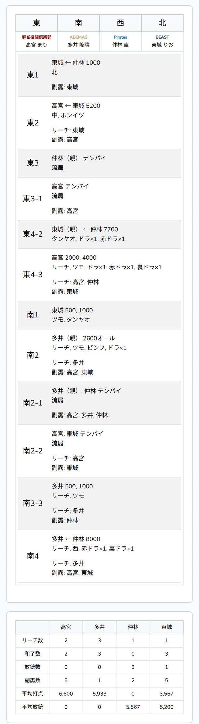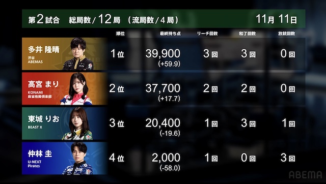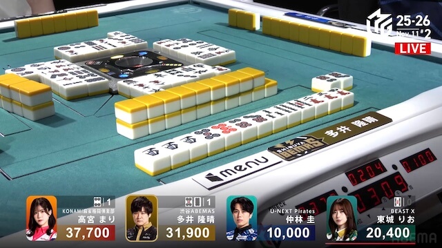は山にない。高宮・多井も追いついてテンパイ。多井はツモ切りリーチを選択し、逆転トップを見る。最後は、テンパイが入った仲林のリーチ宣言牌をとらえると、裏ドラを1枚乗せて8000に。多井は逆転トップとなって、終局した。