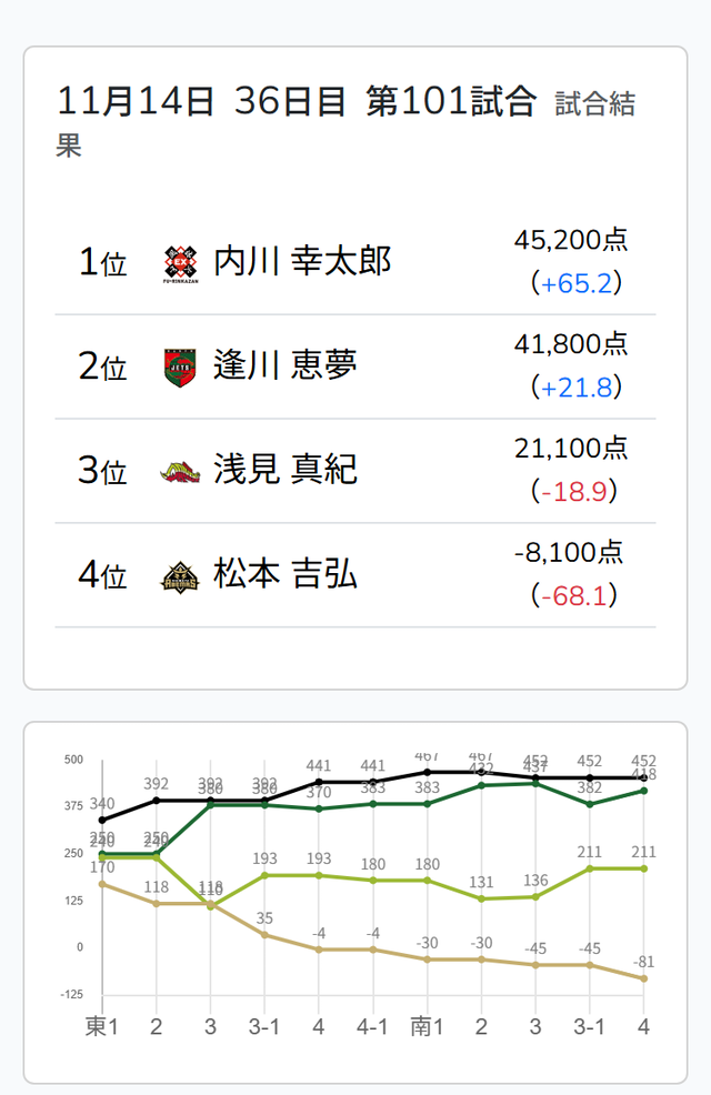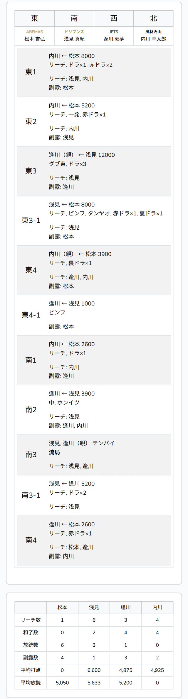 東1局、8巡目に先制リーチを打ったのは内川。親の松本は宣言牌をチーして速度を合わせ、テンパイを入れる。さらに浅見は門前で追いついて、追いかけリーチ。三軒によるめくり合いに。最後は松本が内川のアガリ牌をつかみ、内川がロンアガリ。8000の加点でリードを得る。