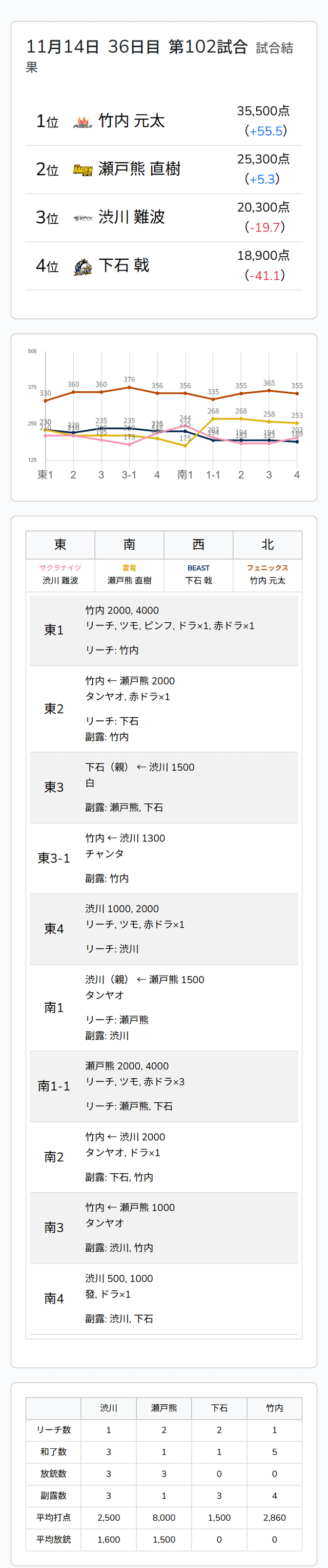 Mリーグ試合速報 11/14 LIVEch 第1試合【渋川・瀬戸熊・下石・元太】麻雀ウォッチ編集部2025年11月14日Mリーグ速報 第1試合結果記事 【11/14 Mリーグ2025-26 第1試合結果】麻雀chは内川幸太郎が的確にアガリを重ねてトップ獲得!LIVEchは的確なかわし手を重ねた竹内元太がトップ獲得! 第2試合結果記事 【11/14 Mリーグ2025-26 第2試合結果】麻雀chは連続親満貫で大きく加点した石井一馬がトップ!LIVEchは苦しい戦いが続いていた雷電に萩原聖人がトップを持ち帰る! 第1試合詳細結果 ©ABEMA 第1試合終了時点のトータルランキング ©ABEMA ▼日程・結果 日程・結果【Mリーグ】-2025-26SEASON ▼選手・チーム成績スタッツ 成績・データ【Mリーグ 2025-26シーズン】 2025年11月14日Mリーグ試合速報 11/14 麻雀ch 第1試合【松本・浅見・逢川・内川】2025年11月14日Mリーグ試合速報 11/14 LIVEch 第2試合【中田・茅森・萩原・阿久津】この記事のライター麻雀ウォッチ編集部麻雀界の最新ニュース、コラム、インタビュー、ランキング、スケジュールなど、麻雀に関するあらゆる情報を発信する日本最大級の麻雀ニュースサイトです。ライターの最新投稿2025年11月14日Mリーグ【11/14 Mリーグ2025-26 第2試合結果】麻雀chは連続親満貫で大きく加点した石井一馬がトッ...2025年11月14日Mリーグ【11/14 Mリーグ2025-26 第1試合結果】麻雀chは内川幸太郎が的確にアガリを重ねてトップ獲...2025年11月14日Mリーグ速報Mリーグ試合速報 11/14 麻雀ch 第2試合【勝又・一馬・園田・多井】麻雀ウォッチ編集部の記事一覧