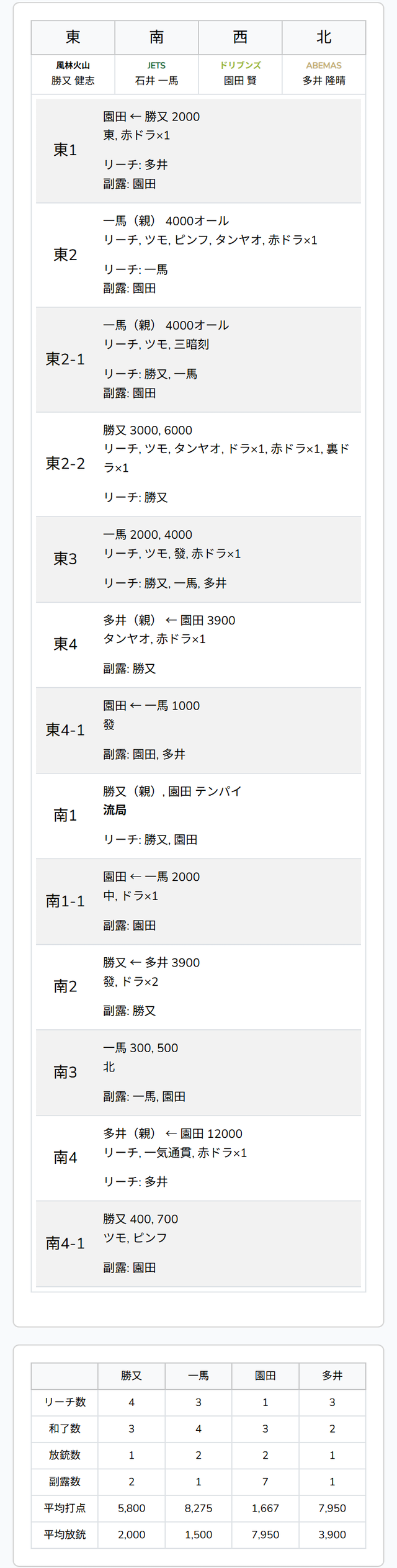 を引きあう中、最後は一馬がツモアガリで2000・4000を加点した。