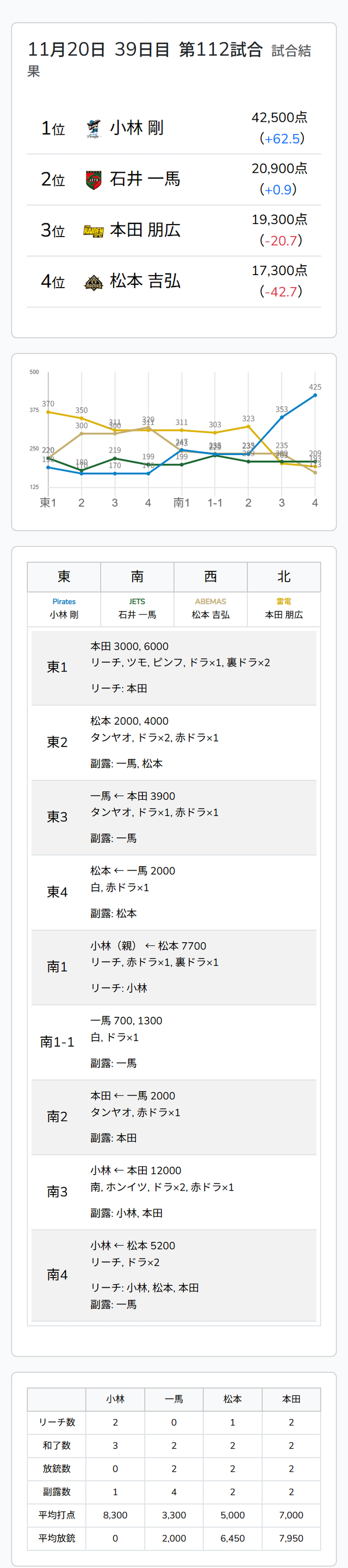 Mリーグ試合速報 11/20 LIVEch 第2試合【小林・一馬・松本・本田】麻雀ウォッチ編集部2025年11月20日Mリーグ速報 第1試合結果記事 【11/20 Mリーグ2025-26 第1試合結果】麻雀chは親番の猛攻で岡田紗佳が今季初トップ!LIVEchは黒沢咲がオーラスの僅差のオーラスを制して逆転トップ! 第2試合結果記事 【11/20 Mリーグ2025-26 第2試合結果】麻雀chはトリッキーな単騎待ちで打ち合いを制した竹内元太が個人2連勝!LIVEchはオーラスの全員テンパイを制した小林剛がトップ獲得! 第2試合詳細結果 ©ABEMA 第2試合終了時点のトータルランキング ©ABEMA ▼日程・結果 日程・結果【Mリーグ】-2025-26SEASON ▼選手・チーム成績スタッツ 成績・データ【Mリーグ 2025-26シーズン】 2025年11月20日Mリーグ試合速報 11/20 麻雀ch 第1試合【岡田・醍醐・東城・勝又】2025年11月20日Mリーグ試合速報 11/20 麻雀ch 第2試合【亜樹・下石・元太・堀】この記事のライター麻雀ウォッチ編集部麻雀界の最新ニュース、コラム、インタビュー、ランキング、スケジュールなど、麻雀に関するあらゆる情報を発信する日本最大級の麻雀ニュースサイトです。ライターの最新投稿2025年11月20日Mリーグ【11/20 Mリーグ2025-26 第2試合結果】麻雀chはトリッキーな単騎待ちで打ち合いを制した竹...2025年11月20日Mリーグ【11/20 Mリーグ2025-26 第1試合結果】麻雀chは親番の猛攻で岡田紗佳が今季初トップ!LI...2025年11月20日Mリーグ速報Mリーグ試合速報 11/20 麻雀ch 第2試合【亜樹・下石・元太・堀】麻雀ウォッチ編集部の記事一覧