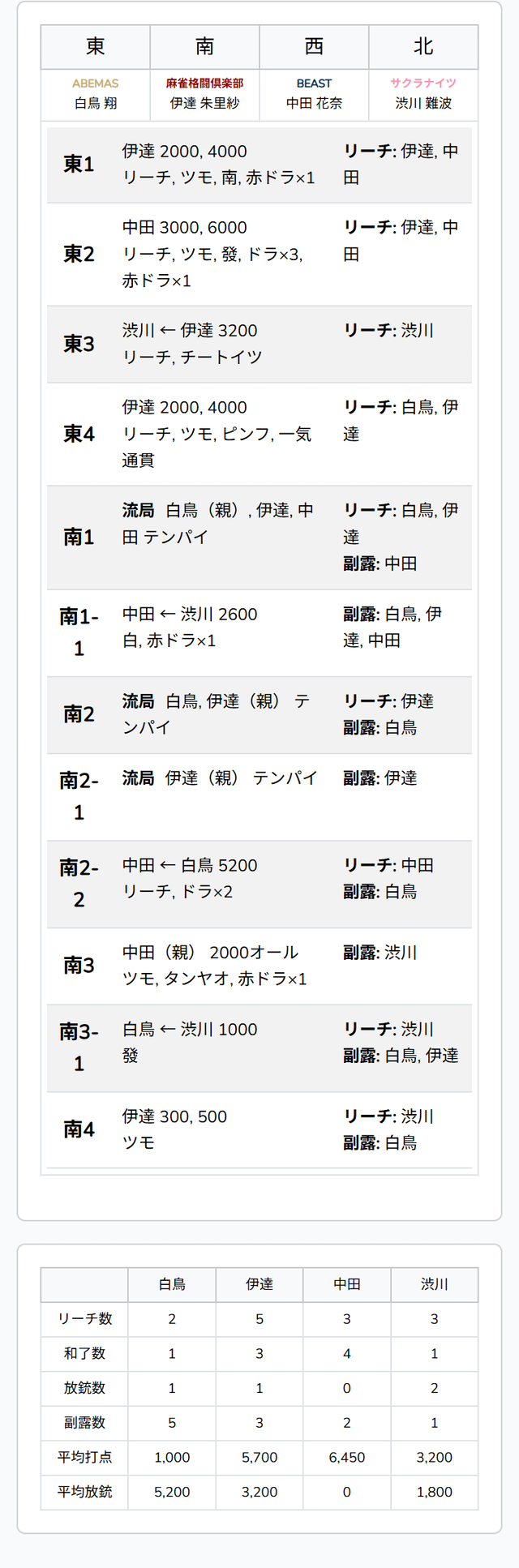 タンキをダマテンに構える。伊達の待ち牌が山から消え、渋川の待ち牌は3枚とも中田が内蔵する中、最後は中田がツモアガリ。3000・6000とした。