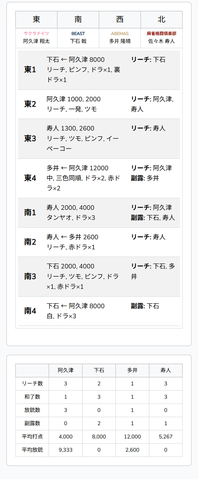 待ちが山に2枚残っている。最後は、阿久津からロンアガリ。下石が逆転トップに、寿人は2着目に、それぞれ着順が入れ替わって終局となった。
