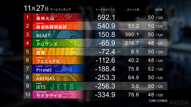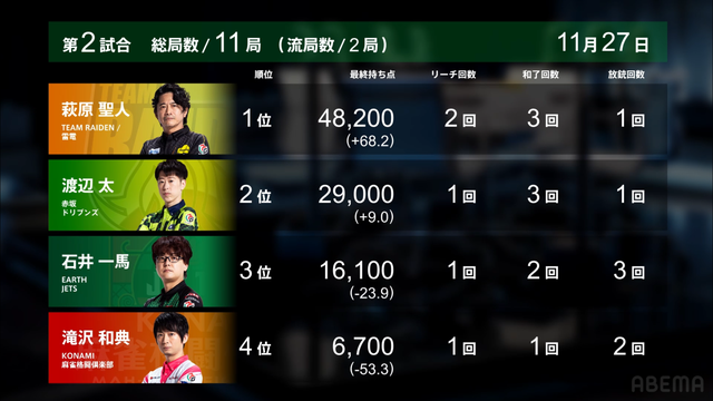 Mリーグ【11/27 Mリーグ2025-26 第1試合結果】麻雀chでは永井孝典が2回のアガリとテンパイ料で堂々のトップ!LIVEchでは勝負の分かれ目供託リーチ棒をかっさらった伊達朱里紗がトップ獲得!