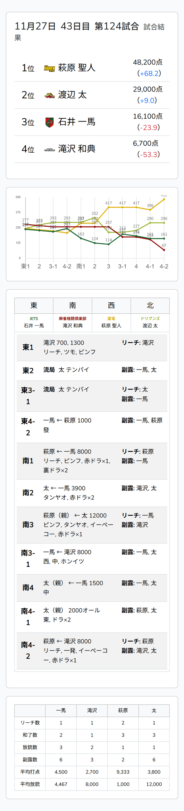 Mリーグ試合速報 11/27 LIVEch 第2試合【一馬・滝沢・萩原・太】麻雀ウォッチ編集部2025年11月27日Mリーグ速報 第1試合結果記事 【11/27 Mリーグ2025-26 第1試合結果】麻雀chでは永井孝典が2回のアガリとテンパイ料で堂々のトップ!LIVEchでは勝負の分かれ目供託リーチ棒をかっさらった伊達朱里紗がトップ獲得! 第2試合結果記事 【11/27 Mリーグ2025-26 第2試合結果】麻雀chは大接戦のオーラスを逃げ切った内川幸太郎がチーム同日連勝を飾る!LIVEchは高打点で接戦を抜け出した萩原聖人がトップで個人3連勝! 第2試合詳細結果 ©ABEMA 第2試合終了時点のトータルランキング ©ABEMA ▼日程・結果 日程・結果【Mリーグ】-2025-26SEASON ▼選手・チーム成績スタッツ 成績・データ【Mリーグ 2025-26シーズン】 2025年11月27日Mリーグ試合速報 11/27 LIVEch 第1試合【本田・柴田・園田・伊達】2025年11月27日Mリーグ試合速報 11/27 麻雀ch 第2試合【小林・内川・阿久津・下石】この記事のライター麻雀ウォッチ編集部麻雀界の最新ニュース、コラム、インタビュー、ランキング、スケジュールなど、麻雀に関するあらゆる情報を発信する日本最大級の麻雀ニュースサイトです。ライターの最新投稿2025年11月27日Mリーグ【11/27 Mリーグ2025-26 第2試合結果】麻雀chは大接戦のオーラスを逃げ切った内川幸太郎が...2025年11月27日Mリーグ【11/27 Mリーグ2025-26 第1試合結果】麻雀chでは永井孝典が2回のアガリとテンパイ料で堂...2025年11月27日Mリーグ速報Mリーグ試合速報 11/27 麻雀ch 第2試合【小林・内川・阿久津・下石】麻雀ウォッチ編集部の記事一覧